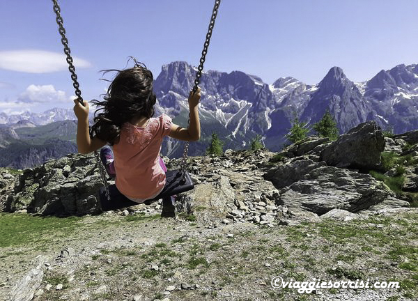 Mentre i bimbi giocano sereni e felici i genitori possono rilassarsi ammirando un panorama mozzafiato: le Pale di San Martino in primo piano, le Dolomiti del Trentino, la catena del Lagorai con Cima d’Asta, le Dolomiti del Veneto e, guardando verso Passo Rolle, l’imponente Marmolada.