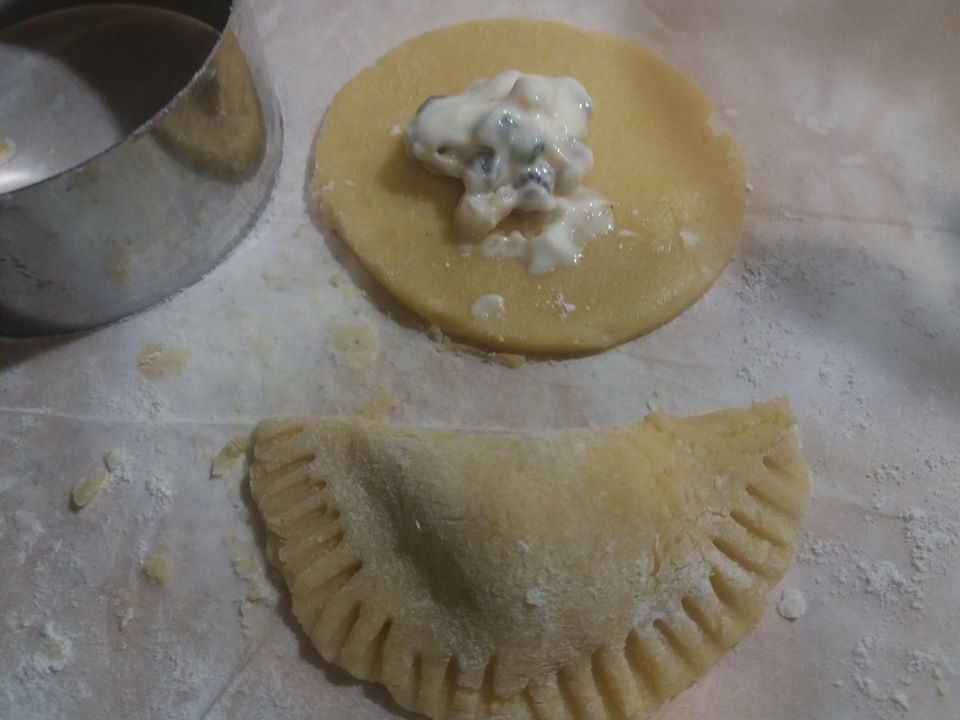 - Al centro un po’ di ripieno, chiuderli a mezza luna e pressare i bordi con i rebbi della forchetta.