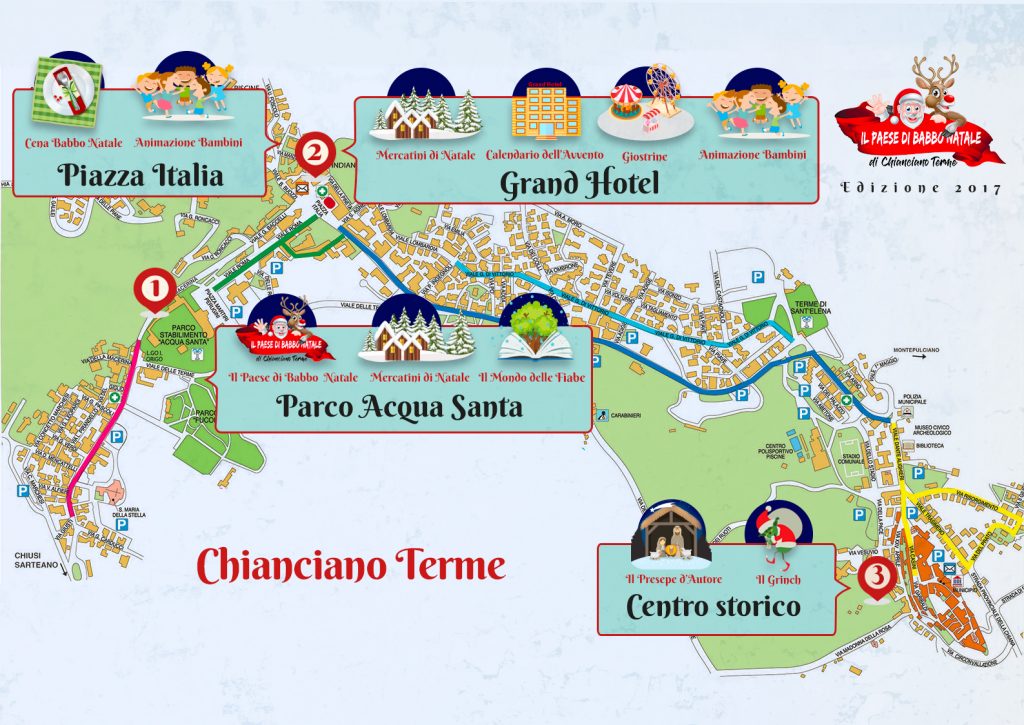 Il Paese di Babbo Natale di Chianciano si trova nel suggestivo Parco dell’Acqua Santa dove si trovano anche le Terme Sensoriali, un luogo già affascinante di suo dove perdersi tra gli alberi secolari e passeggiare su di un grande tappetto di foglie dorate. Al suo interno oltre alle Terme in questo periodo trova spazio un mercatino con bancarelle di vario genere e naturalmente la dimora di Babbo Natale.